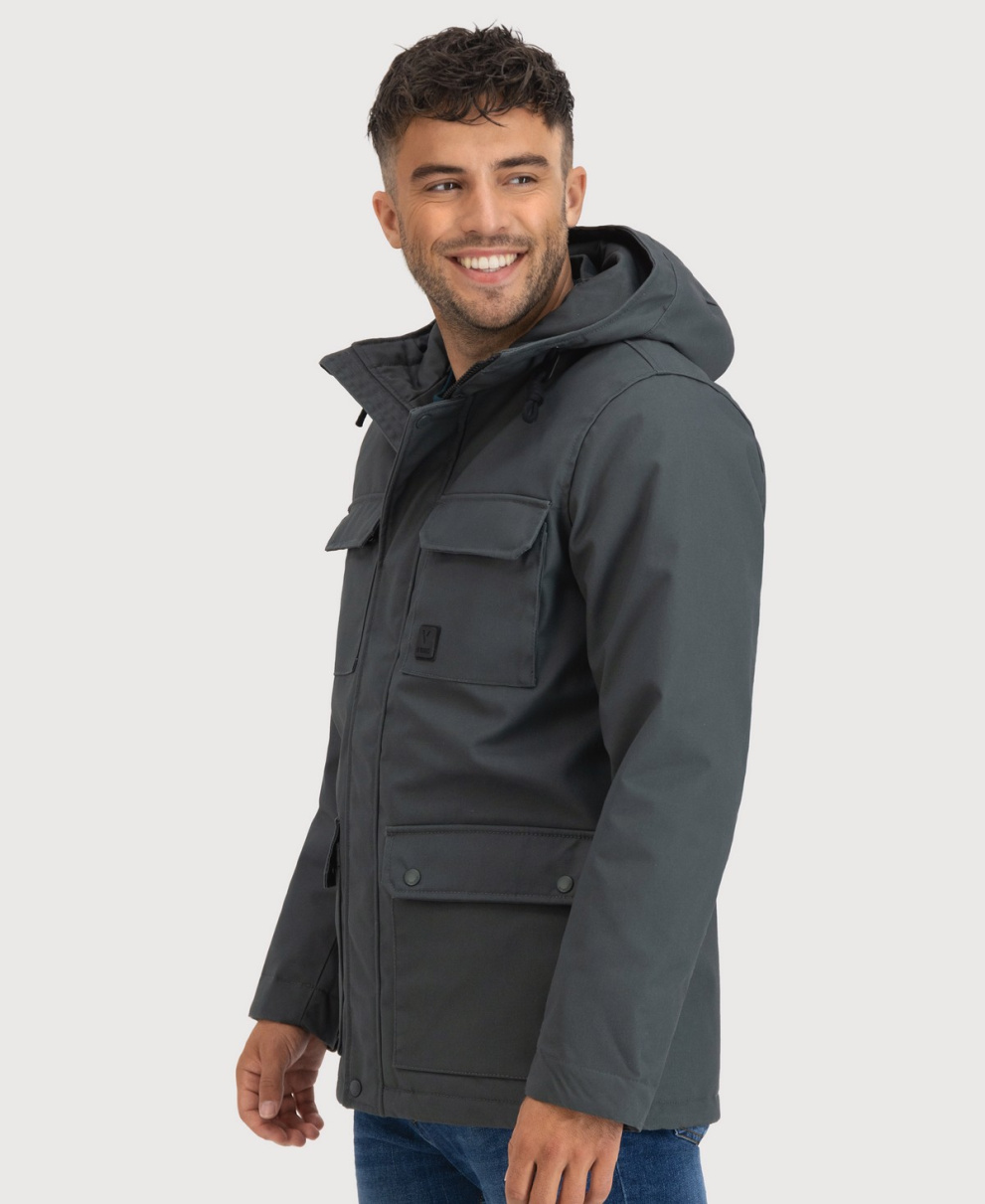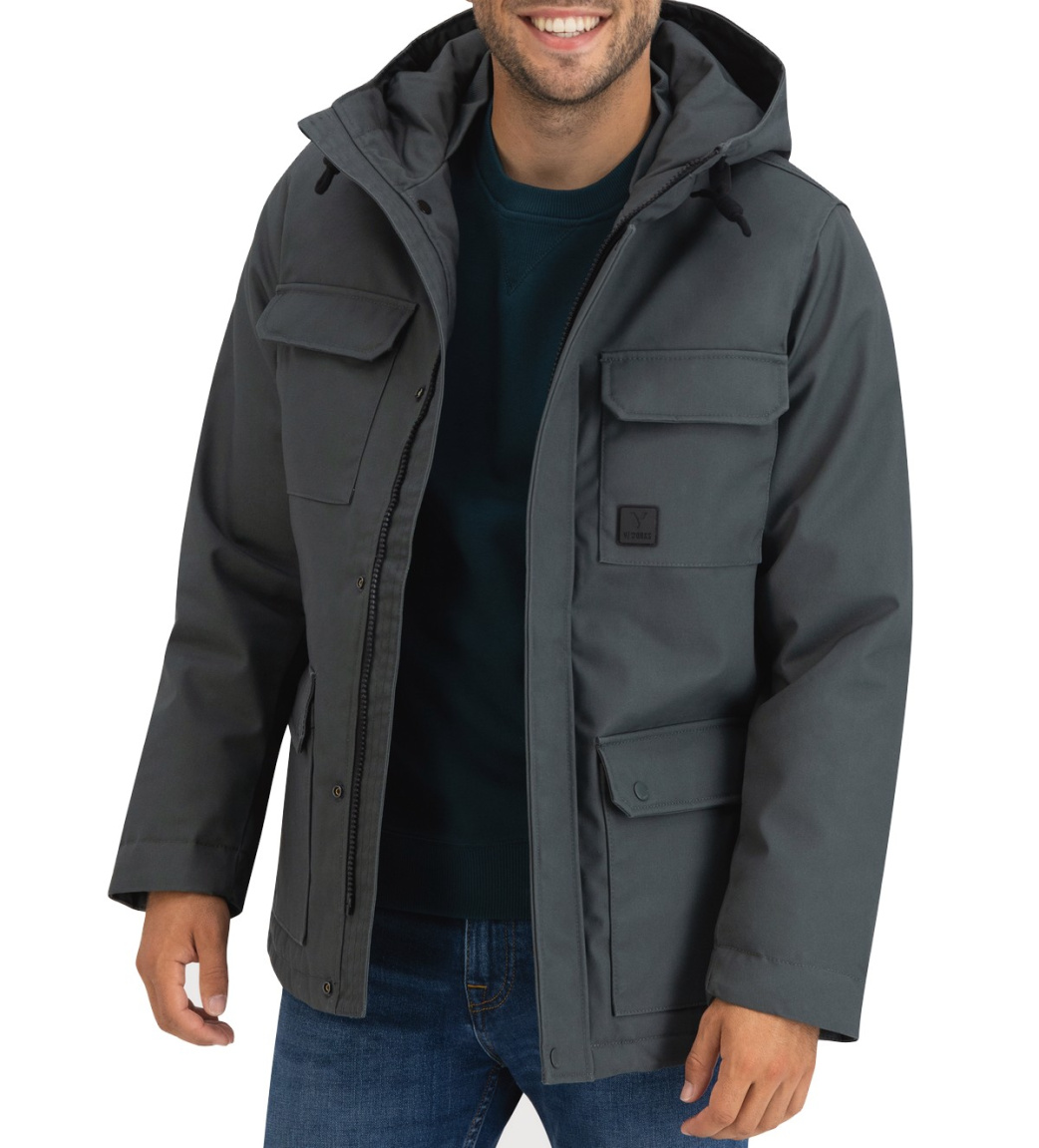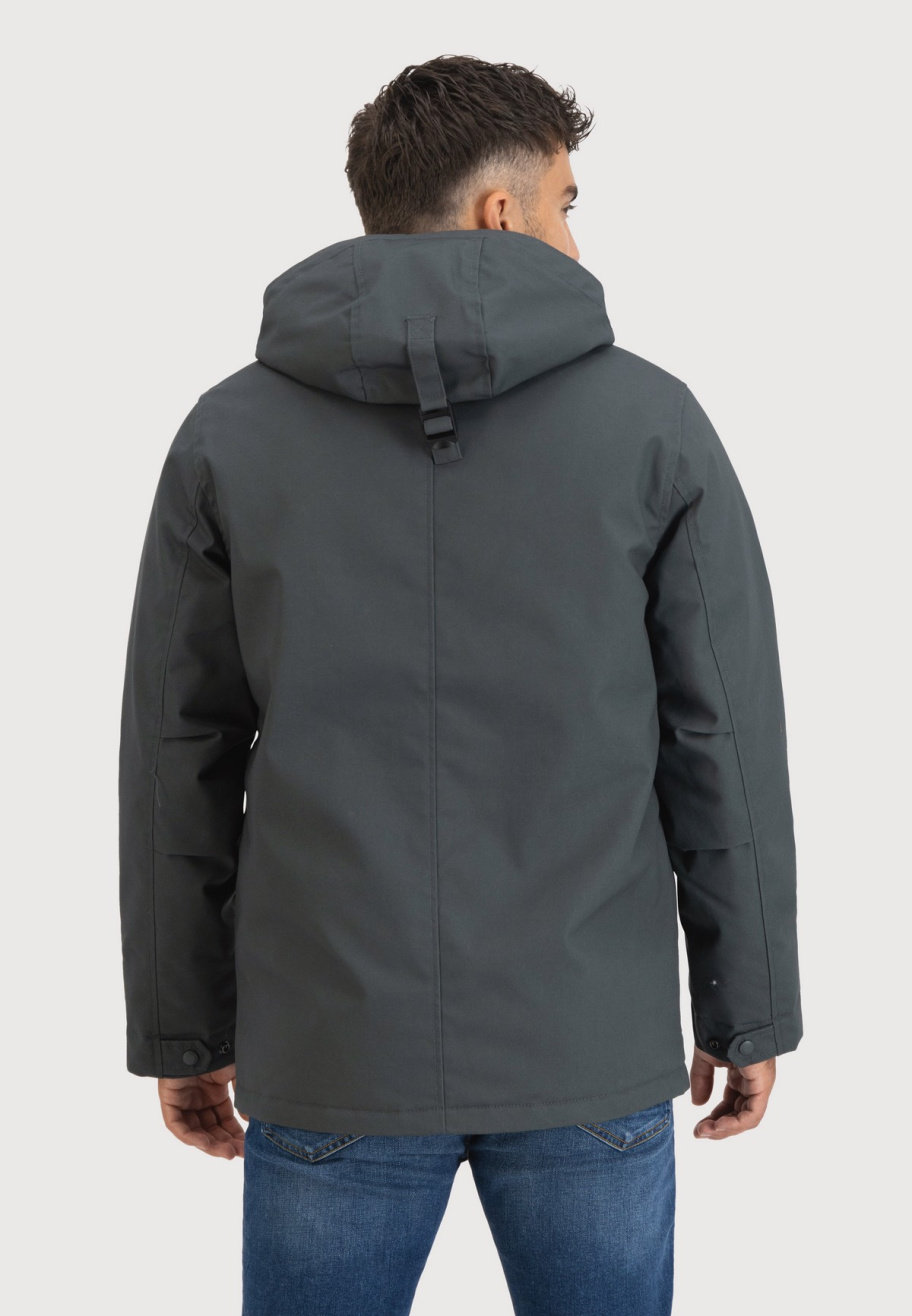 65/35% polyester/cotton canvas, 100% polyester lining, waterproof 3000mm/H2O , breathable 3000g/M2, global recycled padding, GRS, knitted cuffs, adjustable hood, chest and front pockets